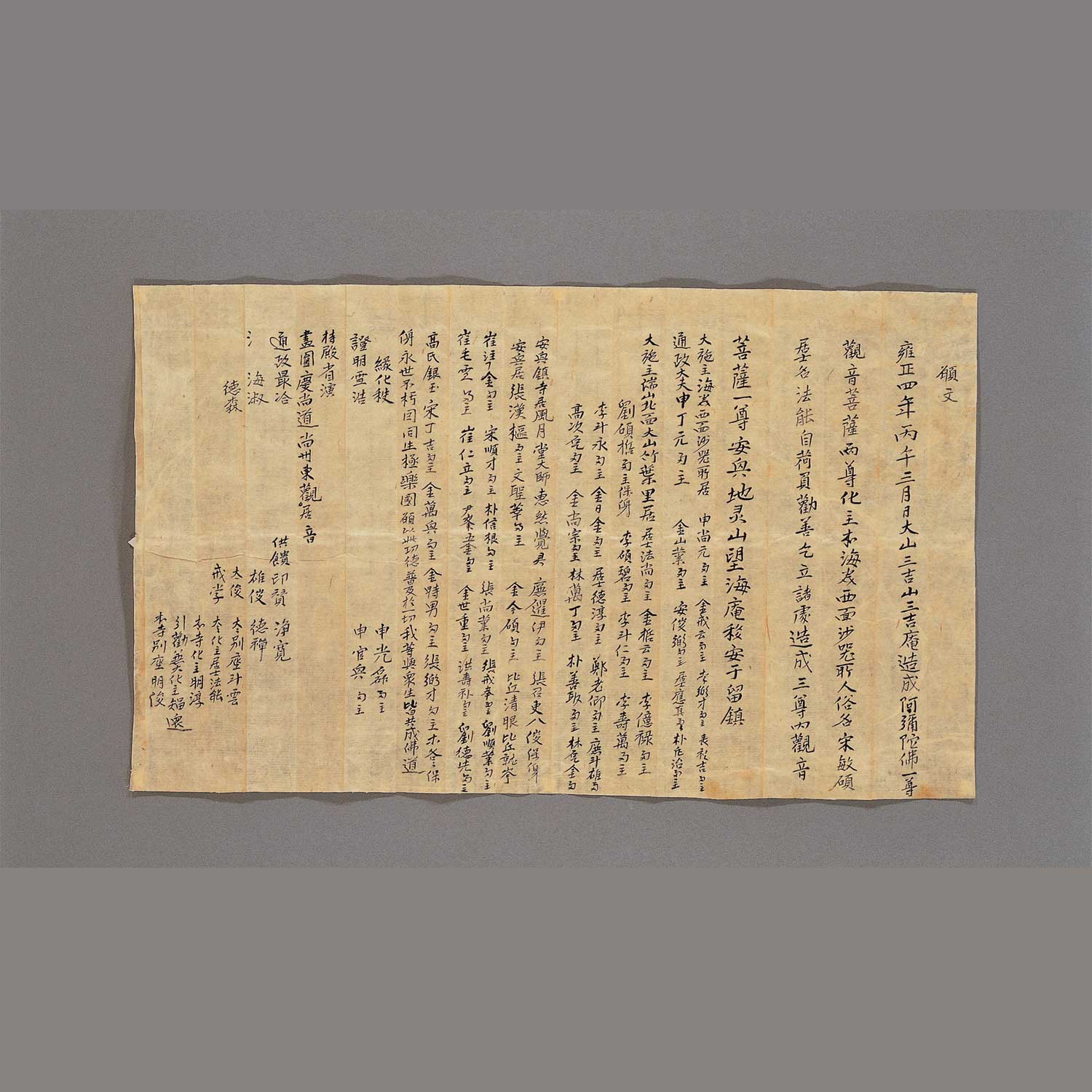 雍正 4년인 1726년 三吉山 三吉庵에서 조성되어 觀世音菩薩 1尊을 安興 지역의 望海庵으로 이전하여 봉안하였다고 기록하고 있으나 본 유물은 태안 興住寺 大雄殿에 봉안되었던 觀世音菩薩의 복장이다.