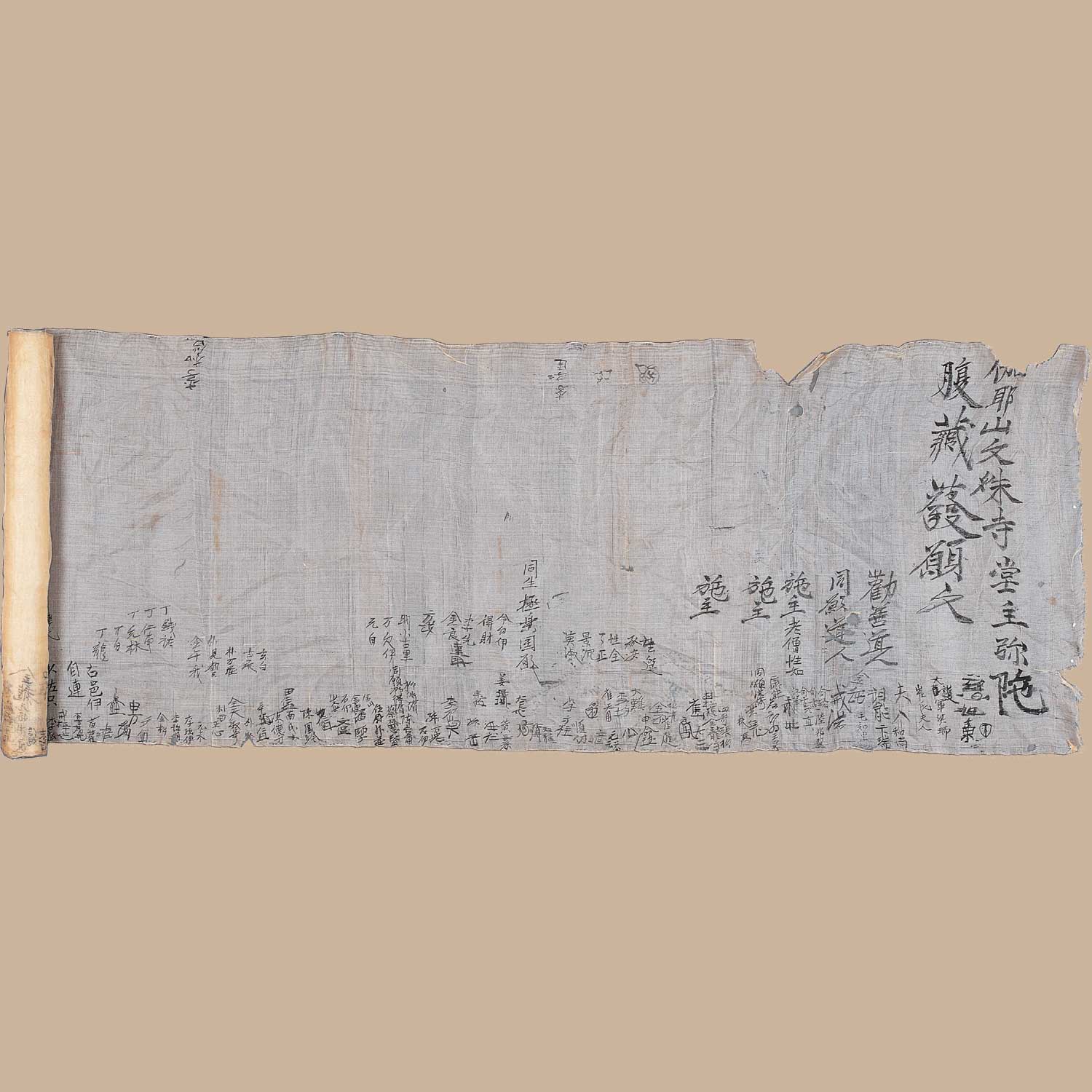 가야산문수사아미타불복장 발원문(發願文) 페이지 정보 작성자 관리자 작성일20-03-13 09:32 조회1,531회 본문 국적/시대 고려(1346년) 재질 견 크기 520×20 지정 보물 제1572호 관리자 근역성보관 인수내용 문수사 기탁 발원문은 인명의 기록에 있어서 한자의 약체나 수결을 그대로 사용하였기 때문에 판독이 어렵거나 불분명한 부분이 많다. 긴 黃白色生綃를 놓고 아래위의 바깥 방향에서 참여한 여러 사람이 각각 임의대로 기입하였는데, 이러한 예는 고려 천수관음보살 복장물에서도 비슷한 예가 보인다. 이전글 다음글 목록