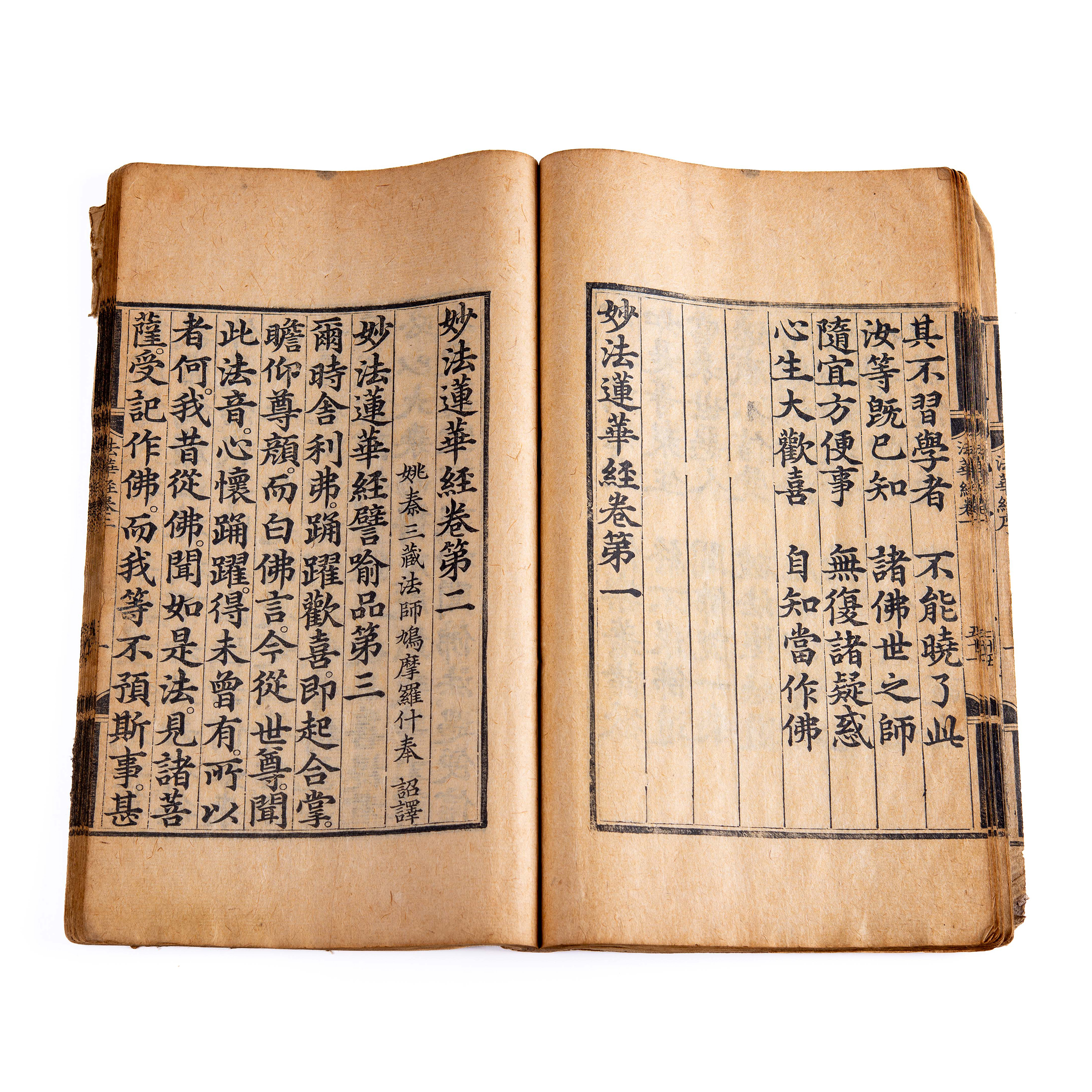 이 책은 1470년(성종 원년) 4월에 세조의 왕비인 정희대왕대비가 발원하여 돌아가신 세조, 예종, 의경왕의 명복을 빌기 위해 간행한 묘법연화경 7권 가운데 권 1~2 이다. 이 책은 권돈일, 고말종, 장막동, 우인수, 최금동, 이영산, 최덕산 등 당대의 일류 각수(刻手)들에 의해 이루어져 새김이 매우 정교하다. 우리나라에서 유통된 법화경은 대부분 계환의 해석이 붙어 있는 것을 사용하였는데, 이때 새긴 법화경은 천도의식용으로 사용하기 위해 원문만 새긴 것이다. 이와 같은 판본으로 기 지정되어 있는 <묘법연화경 권 제3~4, 5~7> 중 권7 말 김수온 발문에 간행동기 및 간행시기가 밝혀져 있어 왕실불교관련 및 서지학적인 가치가 매우 높은 자료이다.