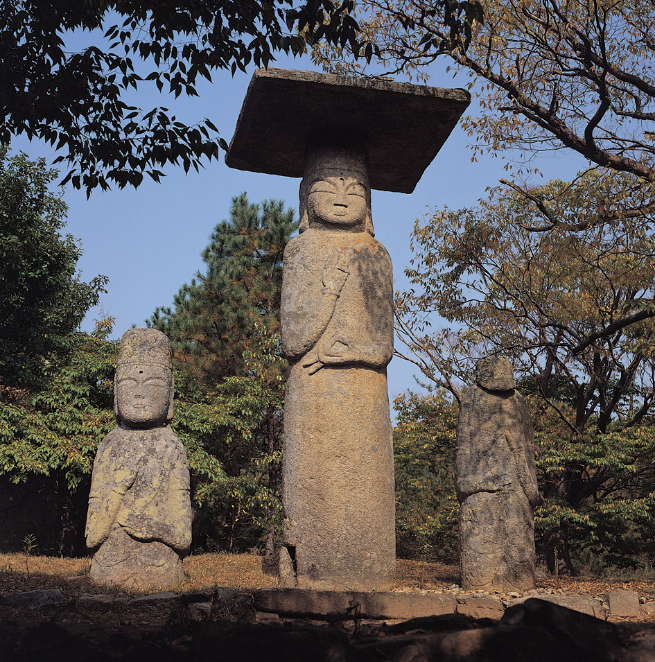 머리에는 커다란 사각형의 갓을 쓰고 있으며, 얼굴은 신체의 비례상 어색하게 큰 편이다. 불상의 몸은 대형화되었는데 인체의 조형성이 감소되어 네모난 기둥같은 느낌을 준다. 또 몸과 어울리지 않게 팔과 손을 붙여 비현실적인 모습을 하고 있다. 오른손은 가슴에 대고 있으며, 왼손은 배에 붙여 엄지와 가운데 손가락을 맞대고 있는 모습이다. 좌우에는 본존불을 모시는 보살상이 있는데, 오른쪽 보살은 허리까지 묻혀 있고 왼쪽 보살은 머리만 파괴되었을 뿐 형식은 본존불과 같다.