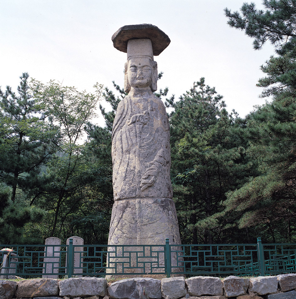 머리에는 두건같은 관(冠)을 쓰고 있고, 그 위에 6각으로 된 갓 모양의 넙적한 돌을 올려 놓았다. 어깨의 윤곽은 아래로 내려가면서 조금씩 넓어지지만 양감이 전혀없이 밋밋하여 마치 돌기둥 같다. 왼손은 몸에 붙인채 아래로 내리고 있고, 오른손은 가슴까지 올려 돌지팡이같은 것을 잡고 있는데 양 발 사이까지 길게 내려오고 있다.