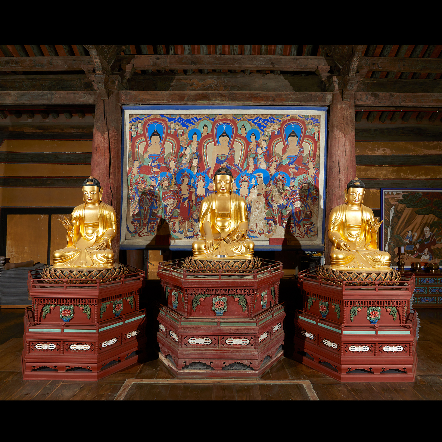 수덕사 대웅전(국보)에 모셔져 있는 목조 삼세불좌상 및 복장유물과 연화대좌, 수미단 등이다.