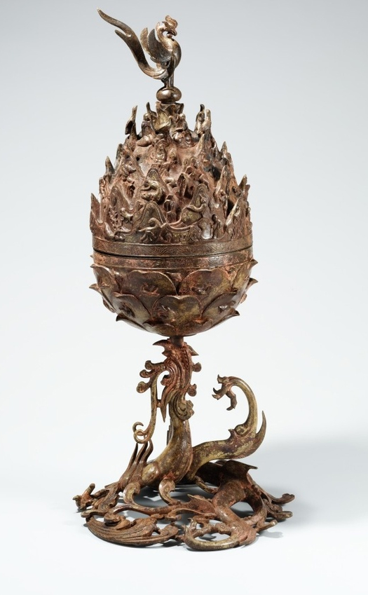 백제금동대향로는 1993년 12월 충남 부여 능산리 무덤들 사이의 절터 서쪽의 한 구덩이에서 450여점의 유물과 함께 발견되었습니다. 논바닥에 엎드려, 일회용 종이컵으로 물을 퍼내가며 조심스럽게 이뤄졌던 발굴 작업 끝에 천사백여 년의 세월을 진흙 속에 묻힌 채 우리 곁으로 돌아온 높이 61.8㎝, 무게 11.8㎏이나 되는 대형 향로입니다. 계속된 발굴 작업으로 출토된 다른 유물에서 백제 위덕왕13년(567년)이라는 기록이 발견되어, 이 향로는 그 후 문화․예술적으로 최고 수준에 이르렀을 7세기에 제작되었을 것으로 유추하고 있습니다. 한 마리의 용이 머리를 들어 입으로 향로를 물고 있는 받침 부분과 불교의 연화화생을 나타내는 연꽃잎으로 된 몸체, 그리고 도교적 사상을 담고 있는 산악과 신선의 모습이 묘사된 뚜껑의 세 부분으로 이루어져 있으며, 정상에는 두 발을 딛고 긴 꼬리와 날개를 젖히고 있는 봉황이 장식되어있습니다. 그 봉황의 가슴 윗부분에는 두 개의 작은 구멍이 뚫려 있어 연기가 나올 수 있도록 만들었습니다. 이 향로 전체에는 신선으로 보이는 인물 21명, 동물 65마리가 있는데, 뚜껑의 정상에는 5명의 인물이 악기를 연주하고 있습니다. 예악(禮樂)으로 나라를 다스린다는 유교사상으로 해석할 수도 있고, 왕에게 제사를 지내는 모습으로 해석할 수도 있습니다. 이렇듯 창의성과 조형성이 뛰어나고 여러 혼합된 종교와 사상적 복합성까지 보이고 있어 백제시대의 공예와 미술문화, 종교와 사상, 제작 기술까지도 파악하게 해주며, 동아시아 고대 금속공예의 최고라는 평가를 받고 있는 귀중한 작품입니다.