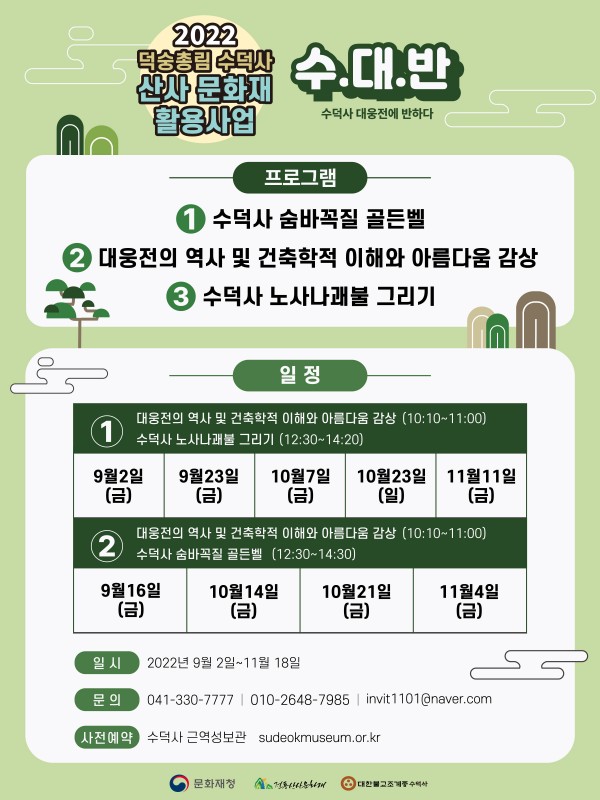 2022년 산사문화재 활용사업 안내 페이지 정보 작성자 관리자 작성일22-08-29 09:06 조회1,970회 댓글0건 본문 2022년 산사문화재 활용사업 수덕사 대웅전에 반하다! 수.대.반. 목록 댓글목록 등록된 댓글이 없습니다.