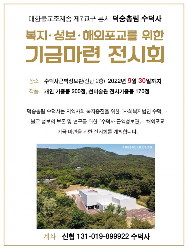 복지,성보,해외포교를 위한 기금마련 전시안내 페이지 정보 작성자 관리자 작성일22-08-29 11:59 조회1,967회 댓글0건 본문 신관 이전으로 인한 임시휴관으로 전시품목 구매를 원하시는 분들은 미리 예약 후 관람 가능합니다. 목록 댓글목록 등록된 댓글이 없습니다.