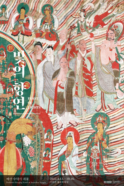 국립중앙박물관은 2022년 부처님 오신 날을 기념하여 열일곱 번째 괘불전 ‘빛의 향연-예산 수덕사 괘불’을 개최합니다. 괘불전은 사찰에서 소장하고 있는 괘불을 직접 볼 수 있는 흔치 않은 기회입니다. 불교 사상과 교리에 익숙하지 않더라도 괘불을 마주하면 말로 설명할 수 없는 강렬한 전율을 느끼게 됩니다. 조성된 지 수백 년이 지났으나 괘불에 담긴 부처의 세계는 그때나 지금이나 화면을 마주한 이들의 마음을 움직입니다.