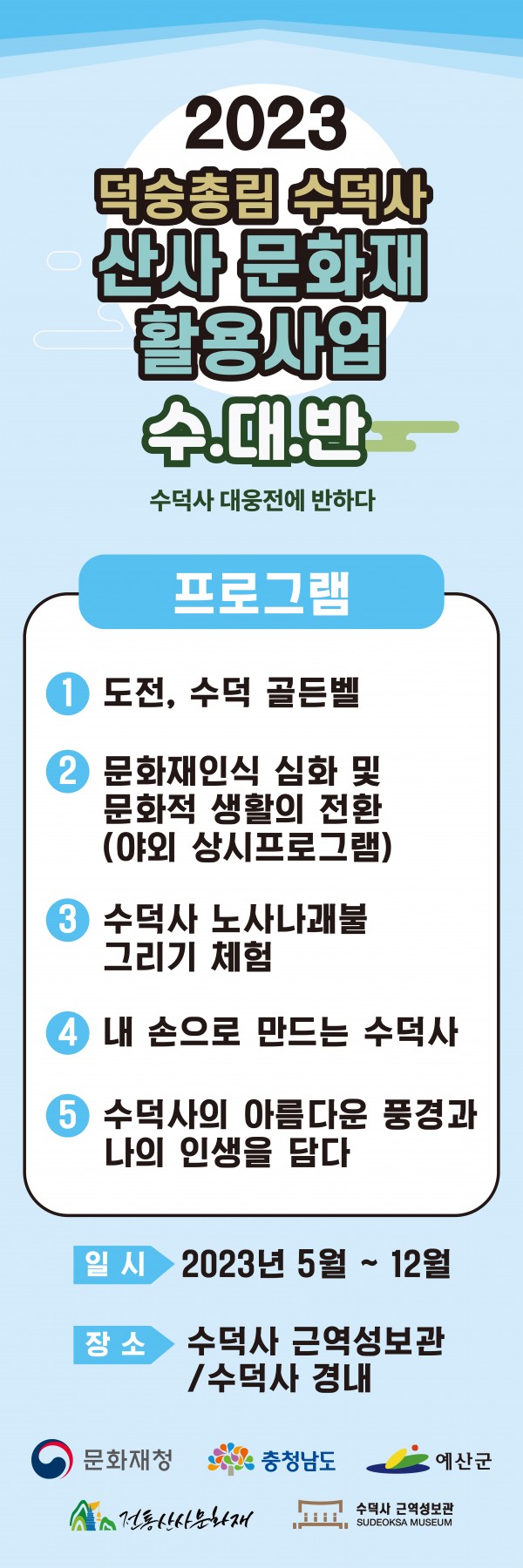 2023년 전통산사문화재 활용사업 안내 페이지 정보 작성자 관리자 작성일23-08-24 16:04 조회1,885회 댓글0건 본문 2023 전통산사문화재활용사업 수덕사 대웅전에 반하다 3(수.대.반 3)문의: 041-330-7777 목록 댓글목록 등록된 댓글이 없습니다.