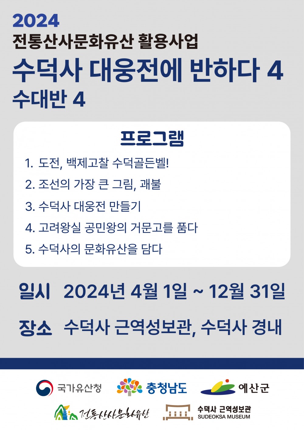 2024년 수덕사 대웅전에 반하다 4(수대반4) 안내 페이지 정보 작성자 관리자 작성일24-04-24 15:25 조회1,779회 댓글0건 본문 2024년 우리고장국가유산 활용사업-전통산사문화유산 활용사업 수덕사 대웅전에 반하다 4(수대반4) 문의: 041-330-7777(수덕사근역성보관) 이전글 다음글 목록 댓글목록 등록된 댓글이 없습니다.